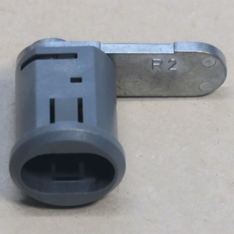 Grey plastic lock sleeve for hinged door mounted on the right/workbench drawer.