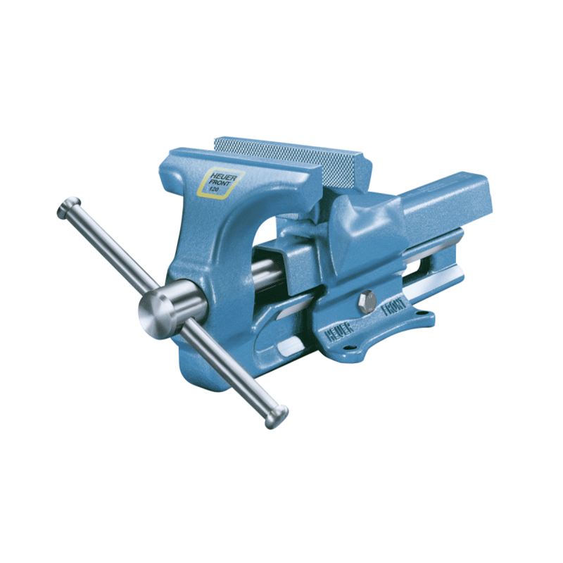 Heuer vice system: Forward-opening vice for vertical clamping of round material, centrally adjustable guides, forged tube jaws andstrong anvil as well as fixed jaws. Proven double prismatic guide prevents dirt and damage. Guarantee period 2 years. Specification: drop-forged steel, surface-hardened fixed jaws, including fastening material. Colour: blue hammer tone or anthracite grey RAL 7016.