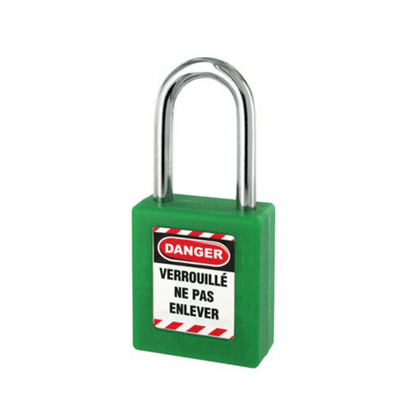 Non-conductive ABS lock body . Stainless steel shackle.Pin mécanism. Double locking. The padlock must be closed to remove the key. 1 brass key. Supplied with a set of labels.