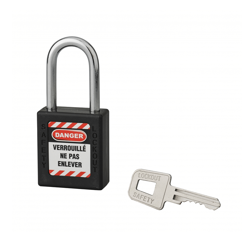 ABS body that does not conduct electricity. Hardened steel vice. Mechanism with pins. Double lock. Captive key function: the lock must be closed to retrieve the key. Set of labels included. Locks resistant to impact, heat and corrosion. Ideal for electrical applications.