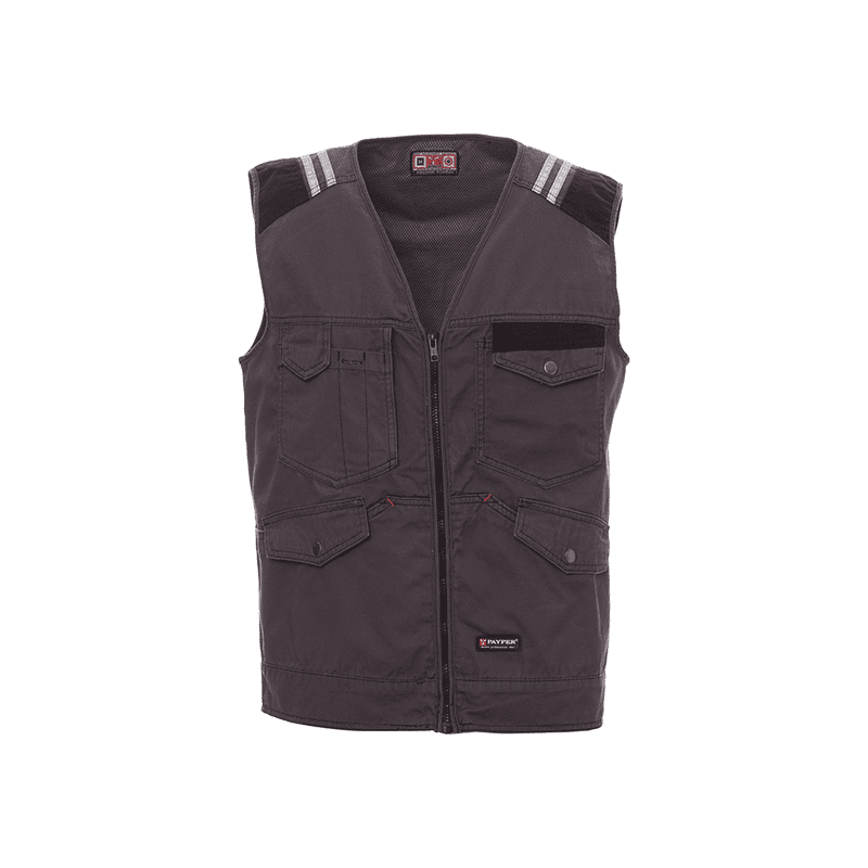TUCSON CHEMITOOL waistcoat plastic front zip, button fastening at waist, three front pockets with LOCK SYSTEM, two kangaroo pocketswith flap and metal button, detachable, collapsible badge holder, multifunction lapel pocket. Reflective tapes on the shoulders. Fit pattern to jeans style. Technical dry lining in contrasting colour, opening for easy printing and embroidery application.