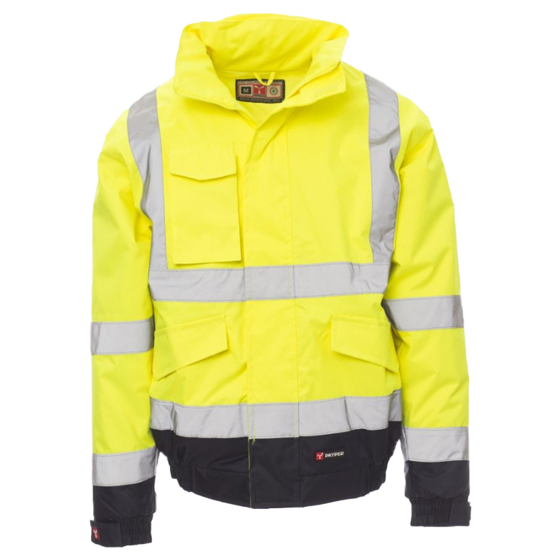 Two-tone high visibility PADDOCK CHEMITOOL jacket with reflective tapes, full zip covered by protective flap, fold-down hood on collar. Elasticated waist and cuffs, two large front pockets with flap and Velcro, mobile phone pocket and washer for attaching a name tag holder: padded interior, one pocket with Velcro, heat-sealed seams.