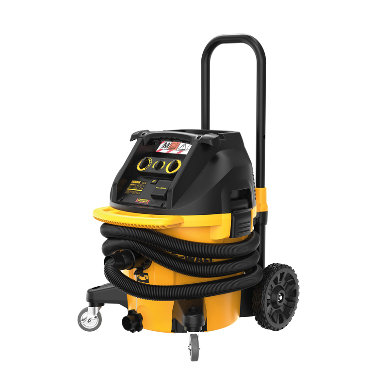 M-Class compliant offering meets ever tightening regional regulations for use on EMEA ANZ jobsites. Improved motor and sealing of the dust extractor provides more air flow and pressure which guarantees market leading performance. Auto Start & Stop Control, offers end users auto-start feature with AC compatible products. Dual Cannister Filters with auto filter clean mechanism maintains unit performance during tough construction applications. Variable Suction Dial allows user to tailor suction to specific application or tool requirements. Large 38L Tank Capacity reduces unnecessary unit downtime. Heavy Duty 3mm Polypropylene Head & Tank are Impact & Drop Resistant For Use In Tough Applications. Telescoping handle and large rear wheels allow easy transportation over jobsite. Audible alarm alerts user if a drop in performance occurs.