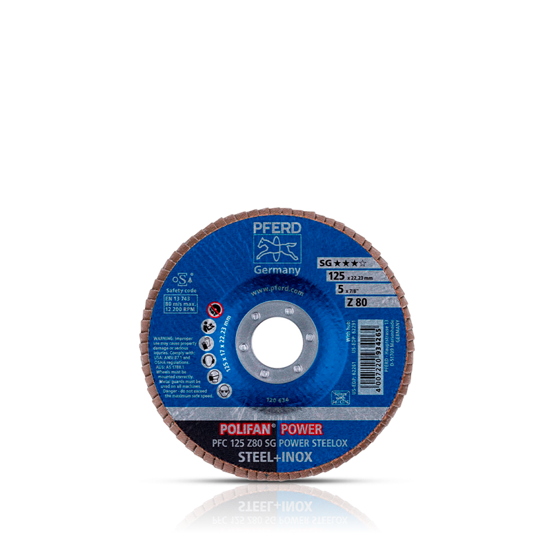 The flap disc POLIFAN POWER convinces with an aggressive stock removal rate and excellent service life, which is why it achieves the highest efficiency. It is the best conventional flap disc for steel.