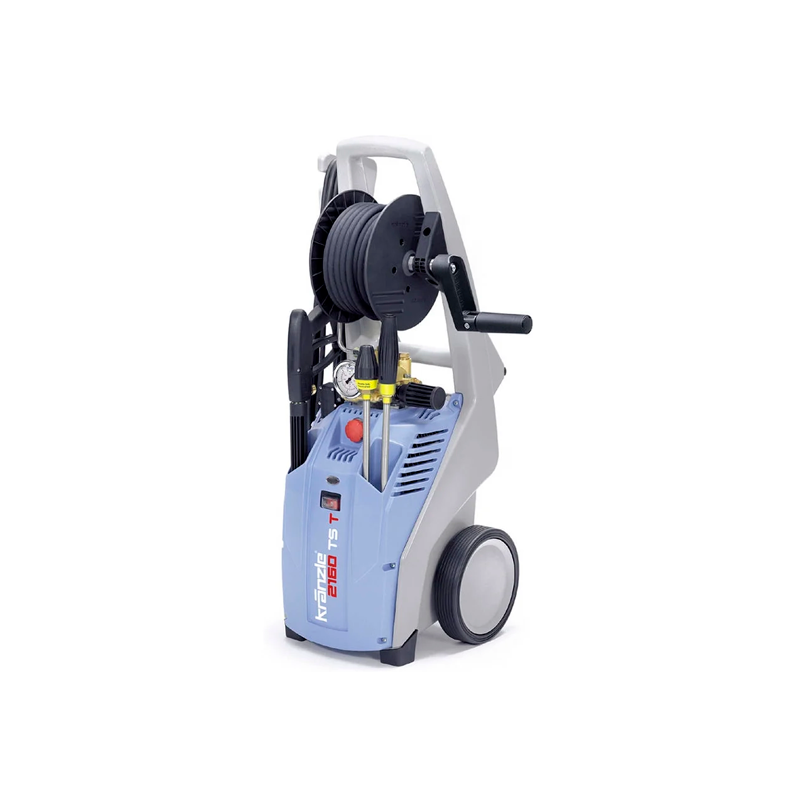 - 3000W electric high pressure washer with maximum pressure of 160 bar with induction motor, brass pump, total stop system, self-priming capability, plastic gun with quick connection and 10 meter long high pressure hose.