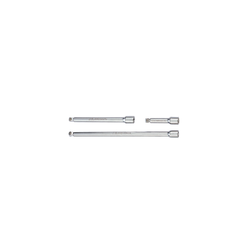 Un juego de tres extensiones de punta de bola de calidad profesional de la serie King Tony 3223 hechas de acero de aleación de cromo vanadio de alta calidad con un accionamiento cuadrado King Tony 3113PR de 3/8 en longitudes de 75,150 y 250 mm.