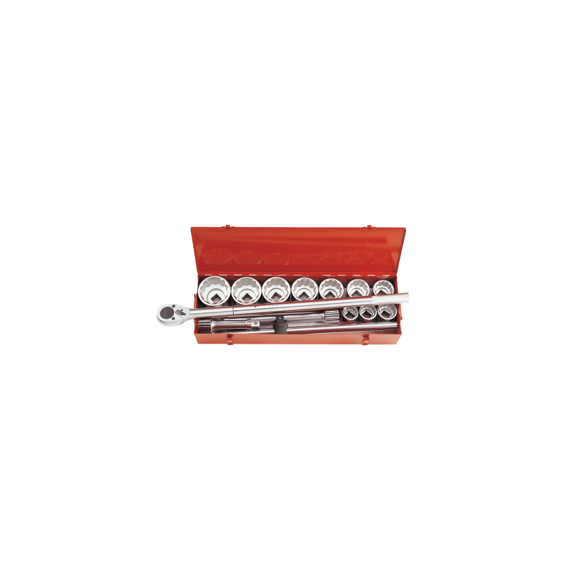 Extensiones 1, 8, 16 KING TONY (8251) - 2 piezas;Tomas estándar de 12 puntos, 1-7/16, 1-1/2, 1-11/16, 1-7/8, 2, 2-1/4, 2-3/8, 2-5/8, 2-15/16, 3-1/8, 1 KING TONY (8330S) - 10 piezas; Collar con correa en T deslizante, 1 KING TONY (8572-25) - 1 pieza;Carraca con mecanismo de retroceso, 1, 24 dientes KING TONY (8779-32F) - 1 pieza;Estuche metálico.