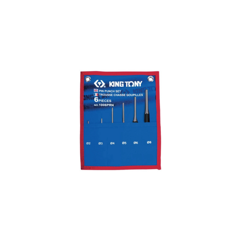 El juego incluye punzones de los siguientes tamaños: ∅2 x 30, ∅3 x 40, ∅4 x 50, ∅5 x 50, ∅6 x 50, ∅8 x 50 mm. Los punzones están hechos de acero al cromo vanadio de alta calidad. Todo el conjunto viene en un estuche de tela con asas reforzadas para colgarlo en lapared.