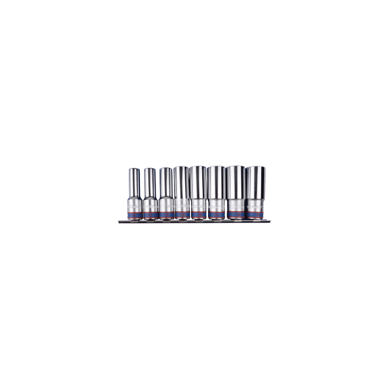 Fabricado en acero cromo vanadio,Acabado cromado,Modelo largo,Viene con un soporte,Accesorio: 1/2 Compuesto por 8 piezas: 12, 13, 14, 17, 19, 21, 22 y 23 mm.