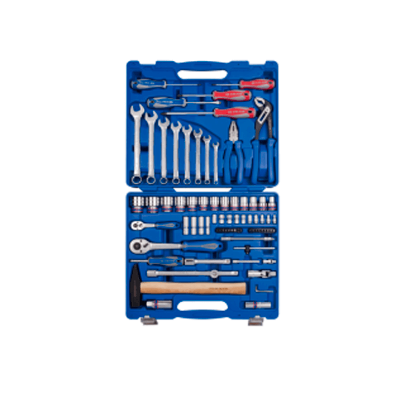 El juego incluye las herramientas más utilizadas: llaves combinadas, destornilladores, alicates, martillo, brocas y vasos para escuadras de 1/4 y 1/2, además de una herramienta para trabajar cómodamente con ellas. El juego viene en un maletín de plástico resistente a los golpes y con cierres metálicos que protegen el instrumento de los daños.Extremos de 6 cabezas de 1/4 y 1/2; puntas para hexágono de 5/16; llaves hexagonales;carracas, cardanes y adaptadores; extensiones y collares; portapuntas y cabezales; alicates; martillo de 300 g; alicates ajustables; llaves combinadas.