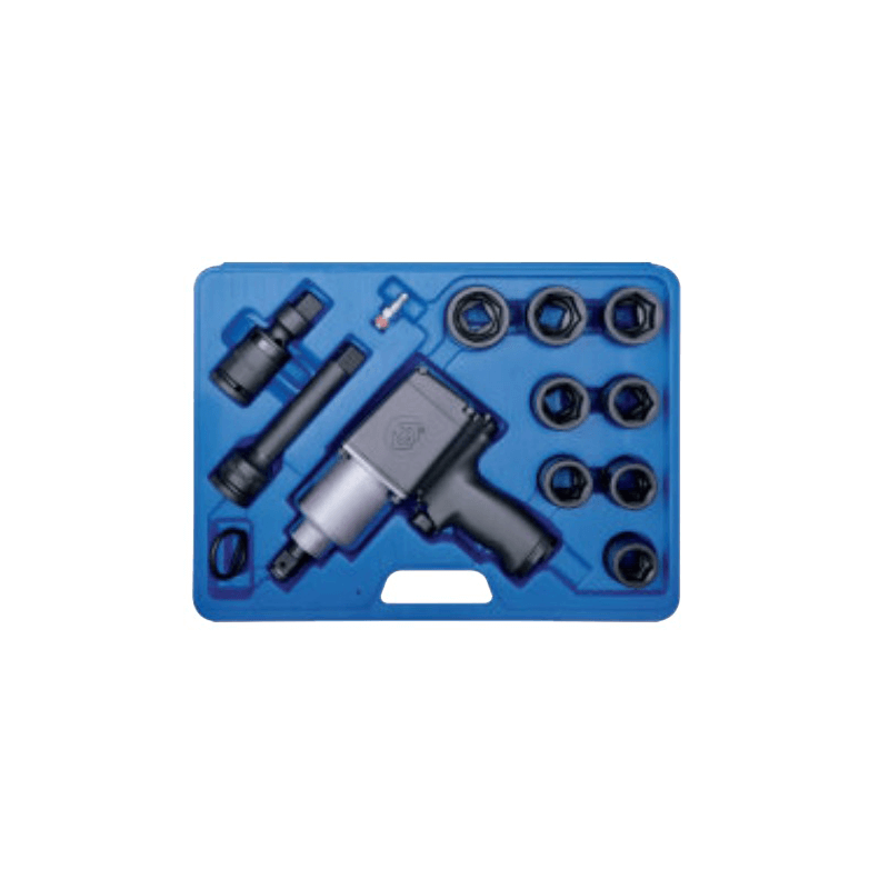 Contiene:8 PC. llaves de impacto 26~38mm,1 PC. llave de impacto,1 PC. barra de extensión, 7 L,1 PC. Junta universal, 1 PC. Ø 5,5 x 37mm,1 PC. pasador Ø 4 x 35,1 PC. adaptador de entrada de aire.