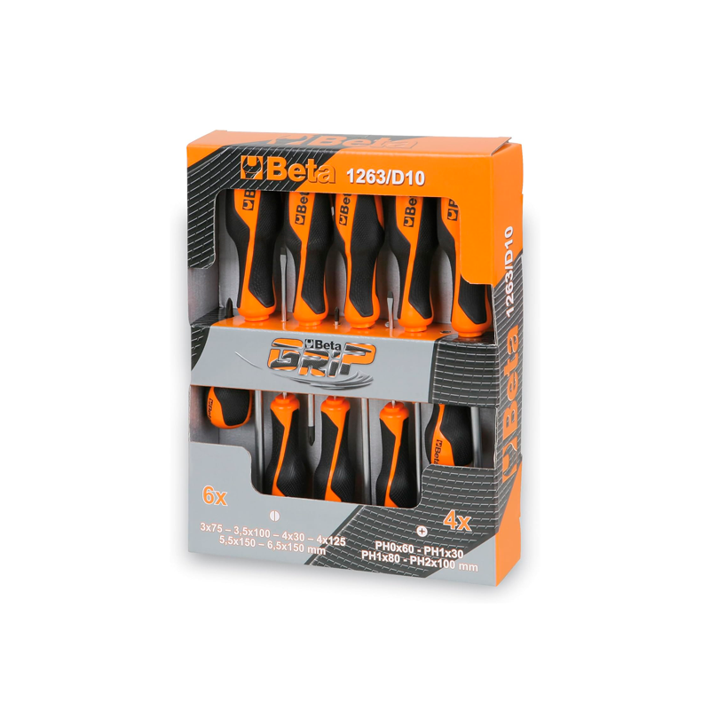 Compuesto por 6 destornilladores y 4 Phillips, este juego de destornilladores Beta Tools 1263/D10 será ideal para profesionales y bricoladores. Los destornilladores están hechos de acero para una mayor durabilidad. Sus asas ergonómicas proporcionan un agarre cómodo y seguro. Color: Negro y naranja Material: Acero Tipos: (0,5 x 3 x 75 mm, 0,6 x 3,5 x 100 mm, 0,8 x 4 x 125 mm, 1 x 5,5 x 150 mm,1,2 x 6,5 x 150 mm) para tornillos ranurados (0,8 x 4 x 30 mm) para tornillos ranurados, serie extra corta (PH0 x 3 x 60 mm, PH1 x 4, 5 x 80 mm, PH2 x 6 x 100 mm) para tornillos Phillips (PH1 x 4,5 x 30 mm) para tornillos Phillips, serie extra corta Mangos de goma dura para un agarre cómodo y seguro El artículo requiere montaje.