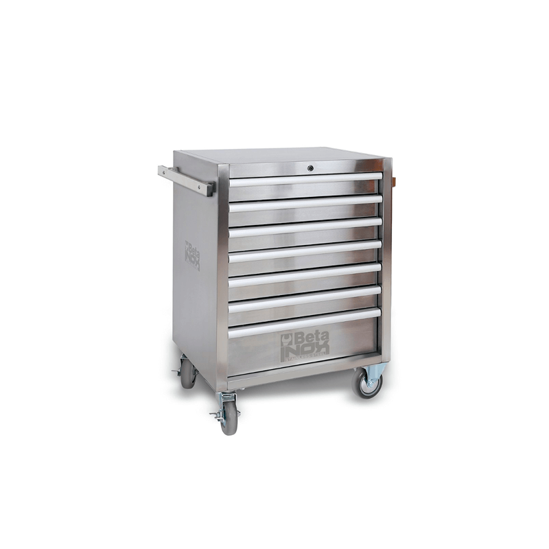 Siete cajones (570 x 410 mm) con guías basadas en rodamientos;6 cajones de 83 mm de altura;1 cajón de 170 mm de altura;4 ruedas de Ø 125 mm;2 fijas y 2 giratorias (dos con freno);Cierre centralizado frontal;Estructura fabricada íntegramente en acero inoxidable;Rodillos, soportes, bolas, interiores de cajones y guías en acero inoxidable;Tiradores de cajones en aluminio;63 kg.