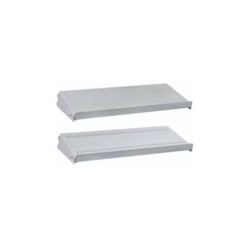 Estantes regulables lisos o ranurados. Los estantes regulables están equipados con un listón de tope en un lado largo. Los estantesregulables se pueden montar delante o detrás con el listón de tope. En estantes regulables ranurados: ranuras cada 15 mm para la subdivisión con paneles de separación. Los estantes regulables, con dos ménsulas, se cuelgan sin tornillos en las columnas de soporte,en posición horizontal o con una inclinación de 15 grados. Capacidad de carga de 50 kg. Altura de la base de 25 mm + listón de topede 17 mm. Dos ménsulas incluidas. Modelo: chapa de acero.
