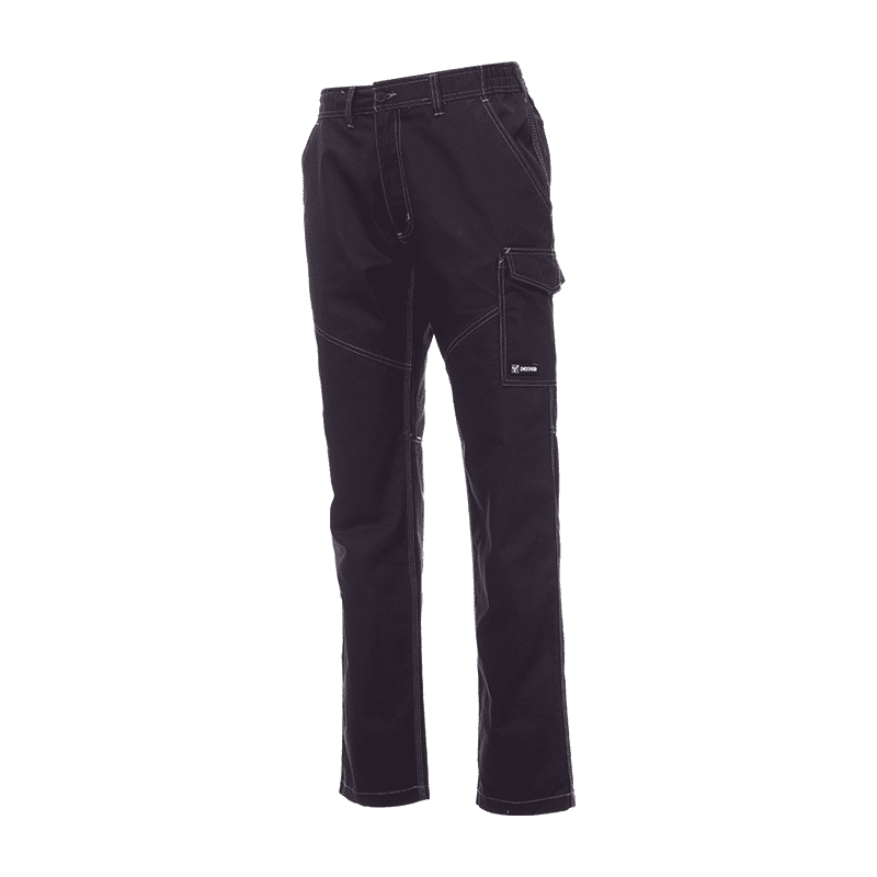 Pantalón CHEMITOOL apto para todas las temporadas con trabillas en la cintura y elástico lateral. Cierre con cremallera y botón de plástico, dos bolsillos clásicos en la parte delantera, bolsillo para cinta métrica, bolsillo lateral con LOCK SYSTEM, dos bolsillostraseros uno de ellos con solapa y cierre de velcro y el otro abierto. Tiene triple costura en la entrepierna y en el interior de las piernas, inserciones de costuras en contraste, cintas reflectantes en uno de los bolsillos traseros.