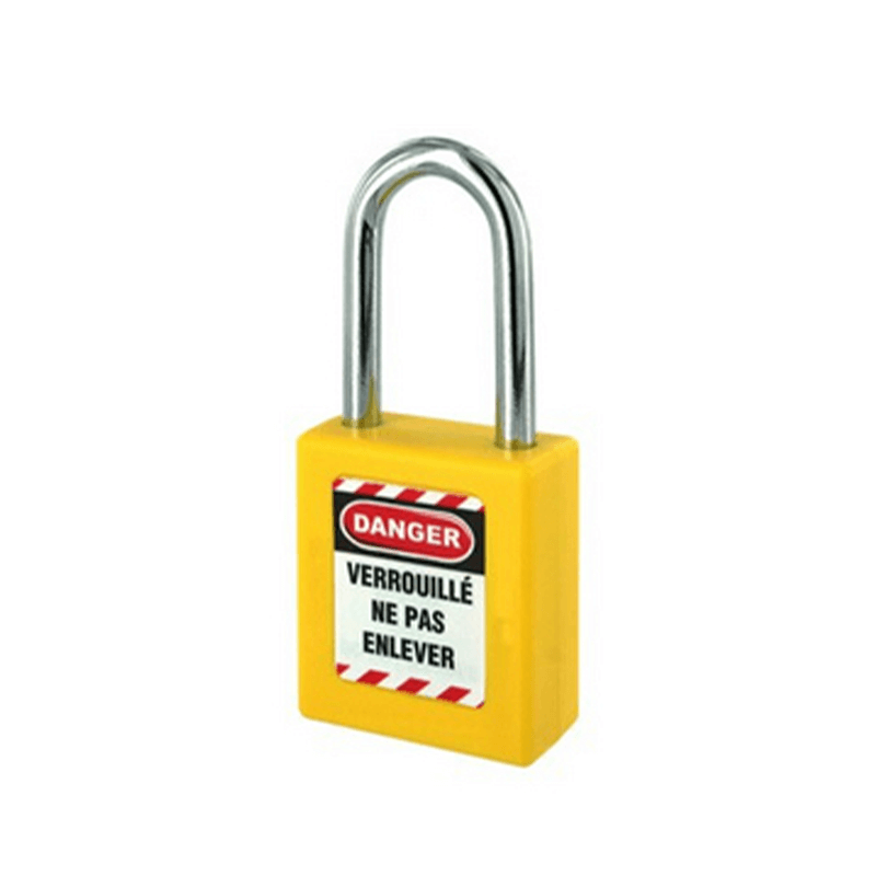 Cuerpo ABS no conductor. Arco de acero inoxidable.Mecanismo de pasadores. Doble anclaje. Llave “detenida”: El candado tiene que estar cerrado para recoger la llave. 1 llave de latón. Entregado con un conjunto de etiquetas.