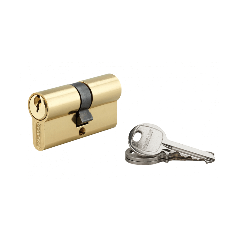 Perfil europeo de latón. Mecanismo con 5 pasadores.Pivote de acero sinterizado. 3 llaves de acero niquelado.