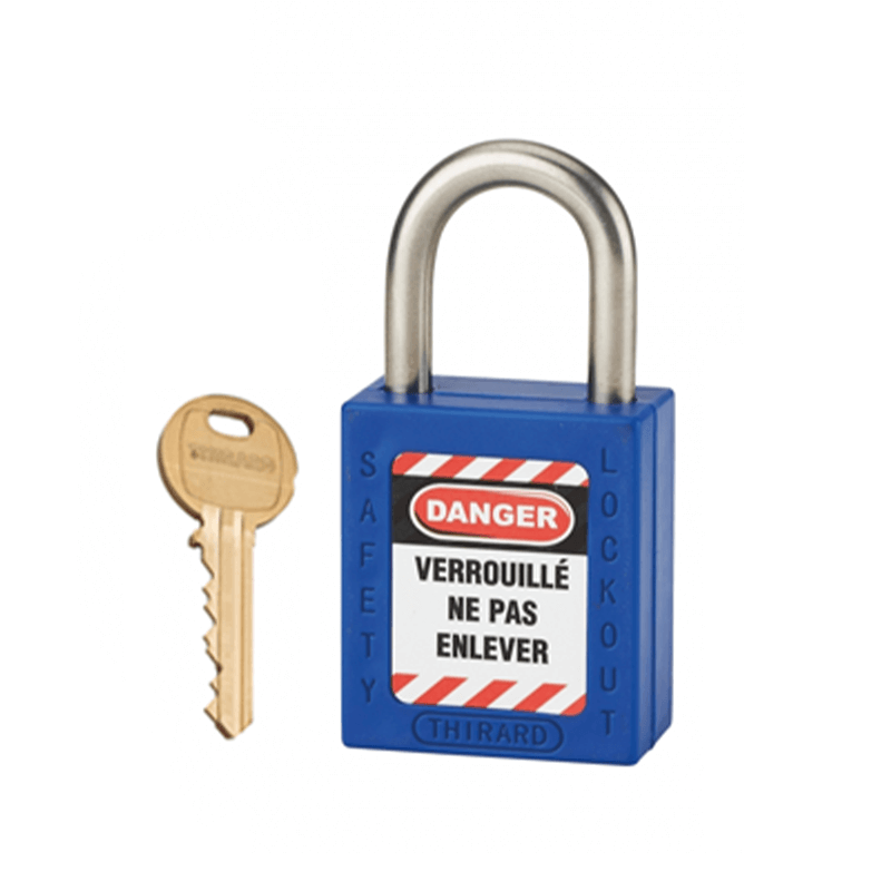 Cuerpo ABS no conductor. Arco de acero inoxidable.Mecanismo de pasadores. Doble anclaje. Llave “detenida”: El candado tiene que estar cerrado para recoger la llave. 1 llave de latón. Entregado con un conjunto de etiquetas.