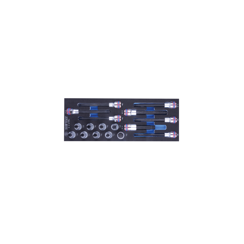 Además, gracias al tratamiento térmico, se redujo la fragilidad del material con el que se fabricaron y se obtuvo una dureza convenientemente elevada: se caracterizan por su resistencia a los daños mecánicos y su durabilidad. Datos técnicos del juego 9-4147PRV :Casquillos 4023: T20, T25, T27, T30, T40, T45, T50, T55, T60,Casquillos 4066: M8, M9, M10, M12, M14 mm,Casquillos 40D0: 6, 8, 10 mm,Dimensiones del inserto: 140 x 375 mm,Peso: 1,81kg.