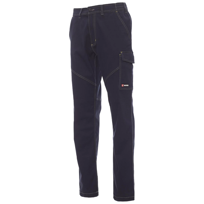 Pantalón CHEMITOOL apto para todas las temporadas con trabillas en la cintura y elástico lateral. Cierre con cremallera y botón de plástico, dos bolsillos clásicos en la parte delantera, bolsillo para cinta métrica, bolsillo lateral con LOCK SYSTEM, dos bolsillostraseros uno de ellos con solapa y cierre de velcro y el otro abierto. Tiene triple costura en la entrepierna y en el interior de las piernas, inserciones de costuras en contraste, cintas reflectantes en uno de los bolsillos traseros.