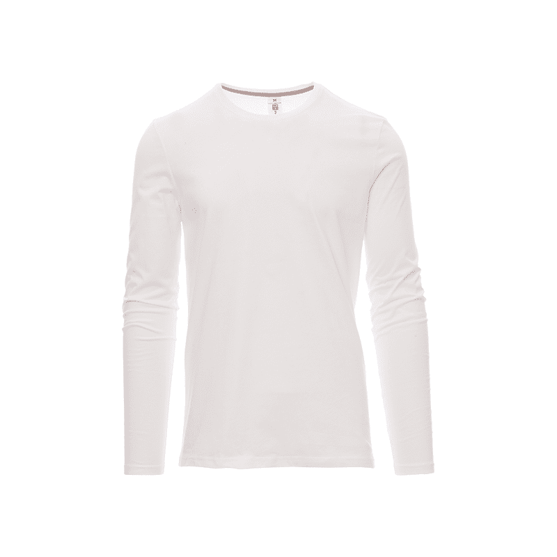 Camiseta de hombre PINETA CHEMITOOL de cuello redondo y manga larga, con banda de cuello de canalé mixto de 1,5 cm y costura superior en la parte delantera, tira de refuerzo en contraste de hombro a hombro visible en el cuello interior, dobladillo elástico, costuras laterales.