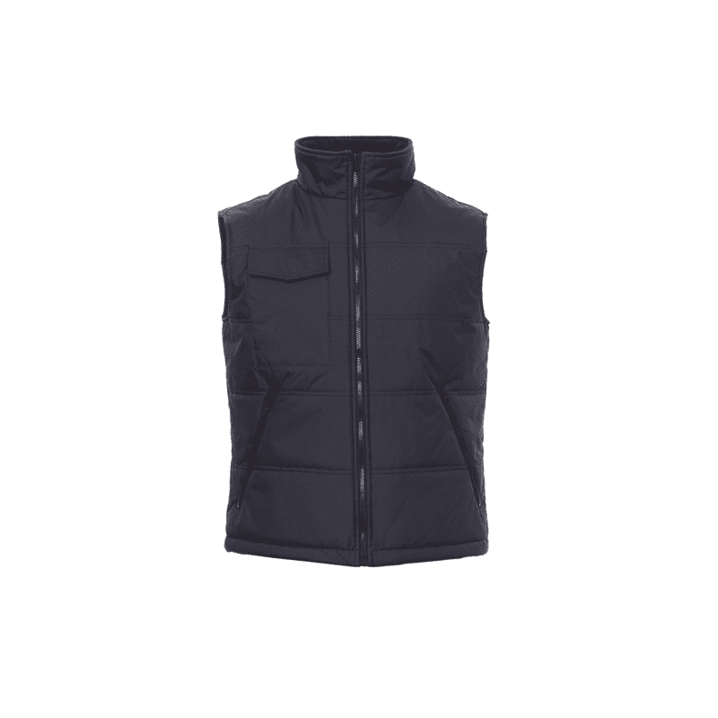 Chaleco cosido con espalda contorneada y tejido acolchado con pespuntes, acabado con forro de alta densidad, interior del cuello enforro polar. Dos amplios bolsillos con cremallera, un bolsillo para el móvil en el pecho y un bolsillo interior.