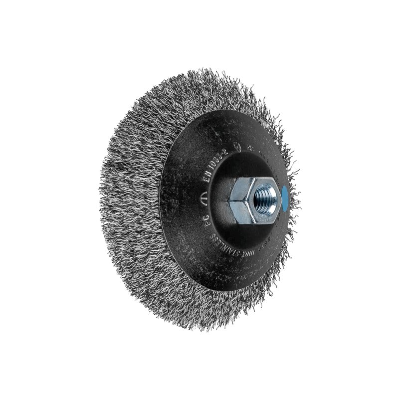 Para cumplir con los requisitos especiales en el procesamiento de acero inoxidable (INOX), PFERD utiliza calidad de alambre 1.4310 (V2A) para todos los cepillos INOX. La experiencia práctica en el entorno industrial confirma que tiene una excelente resistencia a la corrosión, con una vida útil optimizada. Todos los cepillos PFERD con cerdas INOX están marcados en azul y son adecuados para su uso en todos los aceros inoxidables (INOX), como el V4A.
