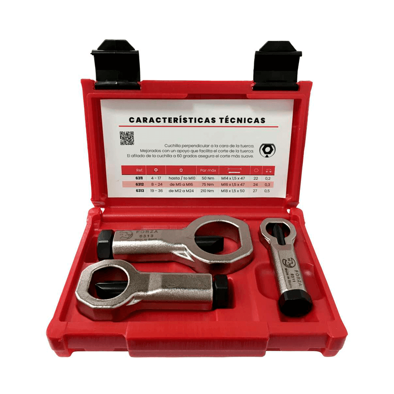 Este set incluye tres modelos distintos de cortatuercas, cada uno optimizado para manejar diferentes tamaños y tipos de tuercas.