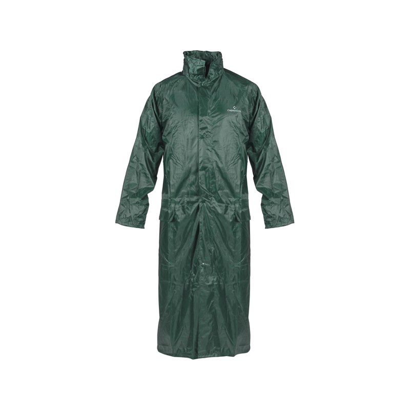 Chubasquero con cierre delantero de cremallera, capucha oculta con cordón ajustable en el cuello, mangas con puños interiores elásticos y bolsillos inferiores con solapa para impedir la entrada de agua.