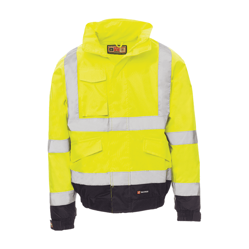 Chaqueta bicolor de alta visibilidad PADDOCK CHEMITOOL con cintas reflectantes, cremallera completa cubierta por solapa de protección, capucha abatible en el cuello. Cintura y puños elásticos, dos grandes bolsillos delanteros con solapa y velcro, bolsillo para elmóvil y arandela para colocar un portaetiquetas: interior acolchado, un bolsillo con velcro, costuras termoselladas.