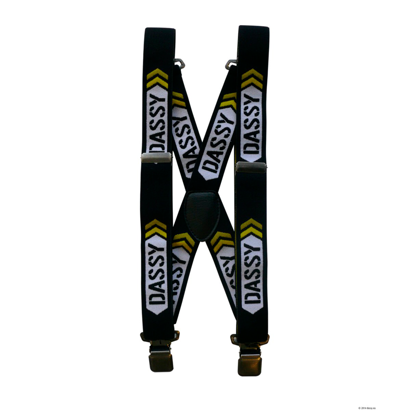¡Un accesorio moderno para completar tu look de trabajo! Estos tirantes elásticos negros con el logotipo de DASSY se fijan fácilmente a tus pantalones de trabajo DASSY mediante clips metálicos.