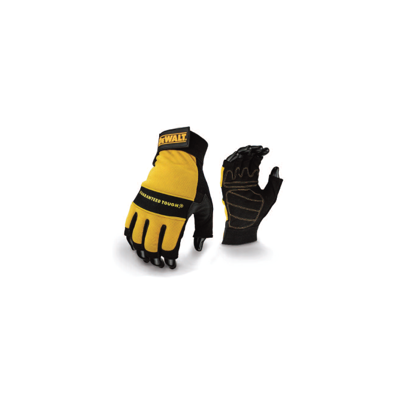 - Guante de piel sintética de rendimiento sin dedos; - Palma de cuero sintético negro con superposiciones rellenas de espuma, diseño de medio dedo, pulgar inglés y nylon negro; - Muñeca elástica con gancho y lazo de extracción TPR, protección de neopreno acolchada para nudillos y 2 partes de tela de poliéster / spandex detrás, protector de uñas de cuero sintético, costuras en contraste de color amarillo en la palma, en el dorso del pulgar tiene tela de toalla para eliminar el sudor; - Diseño sin dedos para una alta destreza y doble costura ToughThread™; - Alta precisión, anti-abrasión y lavable en lavadora. - Talla L.
