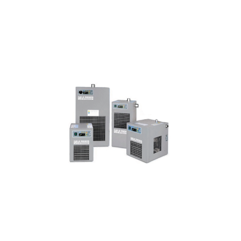 Los secadores de AMD-LH logran el rendimiento excelente incluso en los ejemplos de altas temperaturas ambientales y altas de la entrada. El intercambiador de calor altamente eficiente y ultra compacto puede funcionar eficazmente a temperaturas ambientales hasta 45 ° C ya temperaturas de la entrada de 55 ° C, asegurando una gota de presión reducida del aire comprimido.Los secadores de AMD-LH se clasifican para combinar salidas estándar del compresor. Por ejemplo un compresor de aire de 15 kilovatios (20 HP) con salida teórica de 2400 L / MIN en 7 fósforos de la barra el AMD-LH 25 evaluó 2500 L / MIN. Es por lo tanto innecesario seleccionar un gran modelo: compresor de aire - la combinación del secador es probada y certificada por LA PADANA, dentro de los límites de funcionamiento mostrados en características técnicas.El funcionamiento del secador de AMD es monitoreado por DMC15 que el controlador electrónico que indica la temperatura del punto decondensación digitalmente, controla la válvula de drenaje con