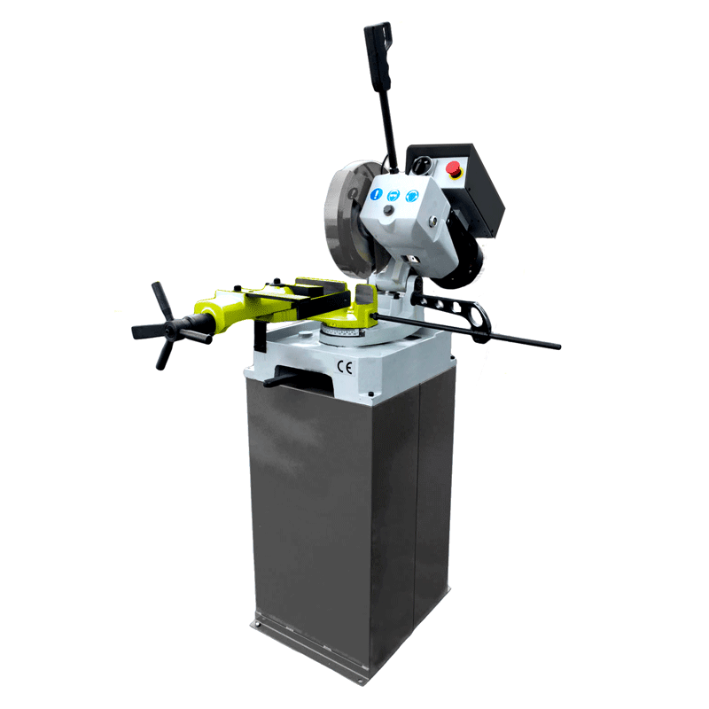 - Mordaza manual; - Cabezal giratorio + 45º; - Bomba refrigerante; - Interruptor de baja tensión; - Protector del disco, según normas; - Interruptor de emergencia; - Máquinas fabricadas según normas CE.