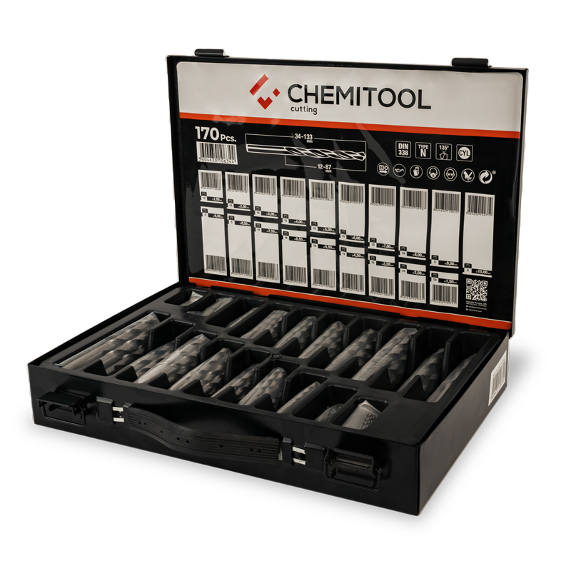 Conjunto de 170 Brocas Espirais Retificadas DIN338 HSS-G Ø1-10mm em Mala Metálica CHEMITOOL CUTTING |
