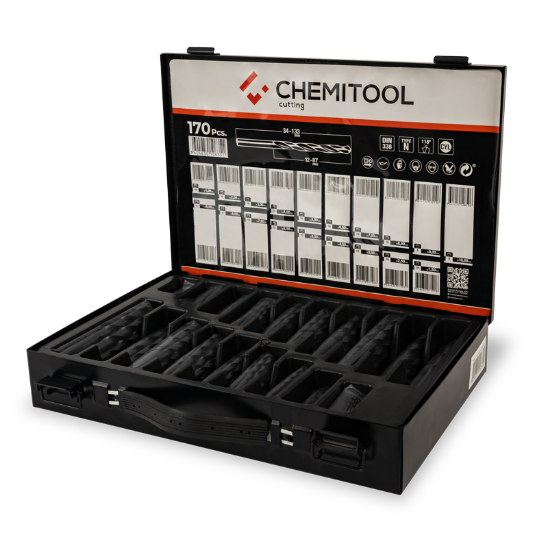 A broca HSS CHEMITOOL é produzida totalmente em aço rápido, preparadas para furações em metais com uma dureza até 800N/mm2, em conformidade com a norma DIN 338.