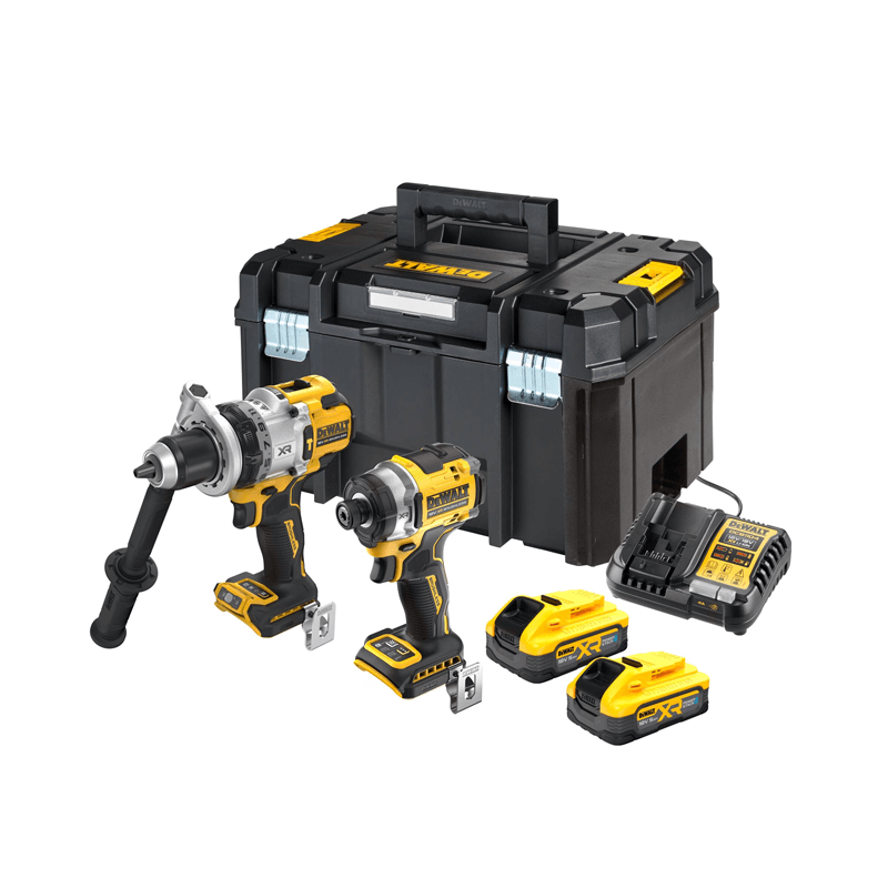 O kit contém: Berbequim Aparafusador Percussão sem escovas XR 18V XRP 13mm 169Nm, Aparafusadora Impacto sem escovas XR 18V 1/4 282Nm, Baterias compacta XR 18V POWERSTACK Li-Ion 5Ah, carregador de 4Ah e mala TSTAK.