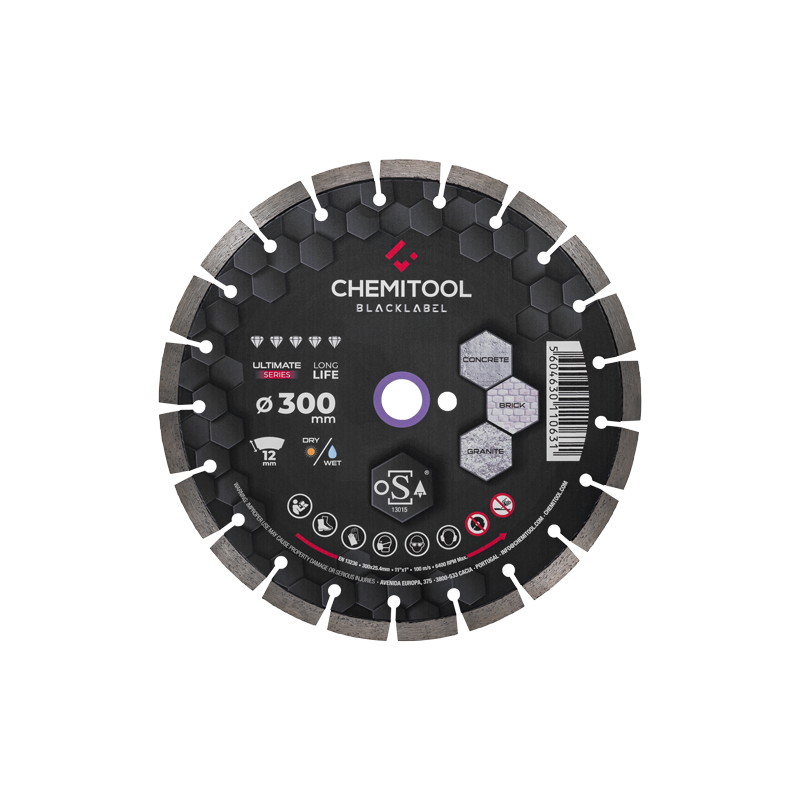 O disco diamantado CHEMITOOL BLACKLABEL é composto por uma densa concentração de grão diamante de elevada qualidade e performance. Conta com uma altura de segmento de 12mm, permitindo assim uma maior longevidade de trabalho.