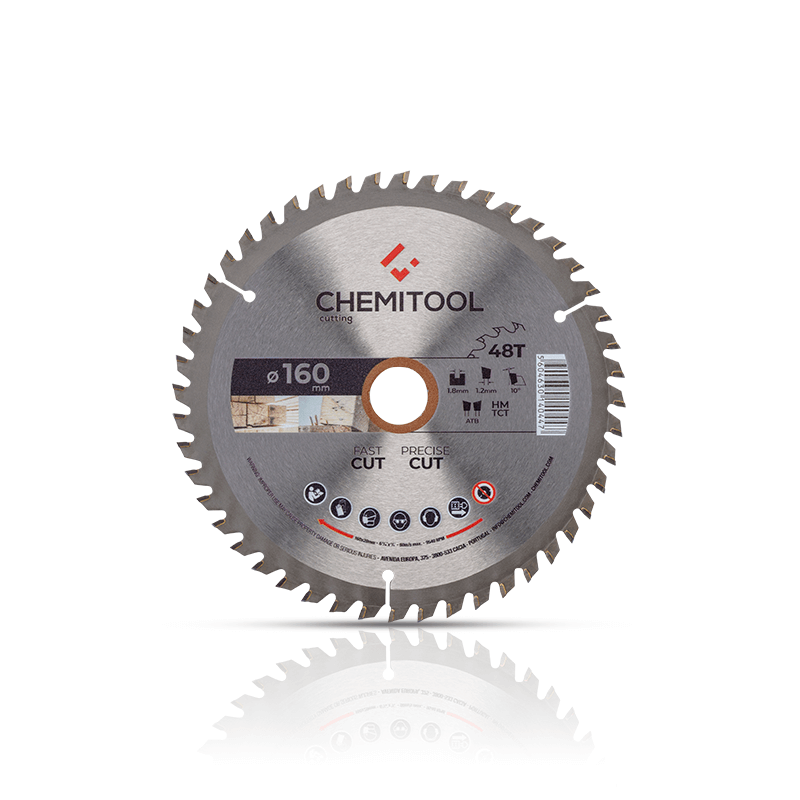 O disco pastilhado CHEMITOOL é composto por dentes em carboneto de tungsténio de elevada qualidade soldados em processo automático.Corpo do disco e ranhuras de expansão são cortadas a laser para fornecer robustez e precisão evitando assim a deformação no sentidode obter uma ótima relação qualidade/valor.O disco pastilhado para construção tem como principal característica, a rapidez e a agressividade no corte. A geometria do dente emATB (Dente Alternado) juntamente com o formato do disco, permite a este tipo de disco fazer cortes em madeiras com pregos, por uso limitado.