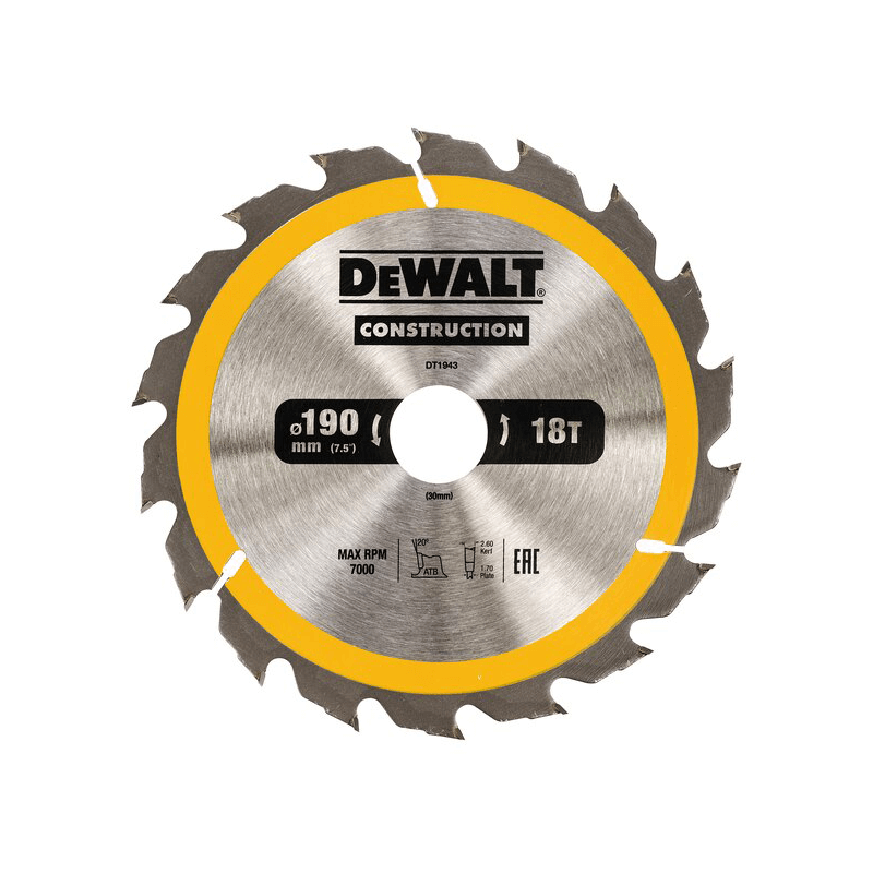 Lâmina para serra circular portátil para construção DeWalt (190mm x 30mm x 18D) |