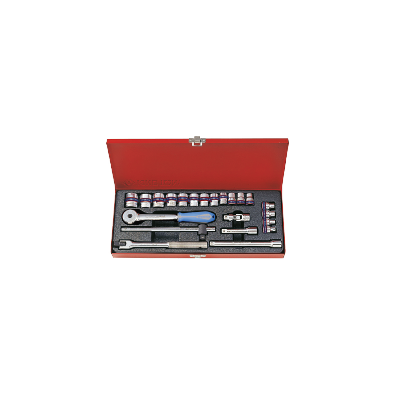 Contém:16 soquetes de 12 lados 6, 7, 8, 9, 10, 11, 12, 13, 14, 15, 16, 17, 19, 20, 21, 22mm;2 conectores 75, 150mm;1 chave de torque reverso 250mm;1 braço em T 200mm;1 alavanca automática 200mm;1 cabeça agitadora 50mm;Dimensões: 372 x 150 x 40mm.