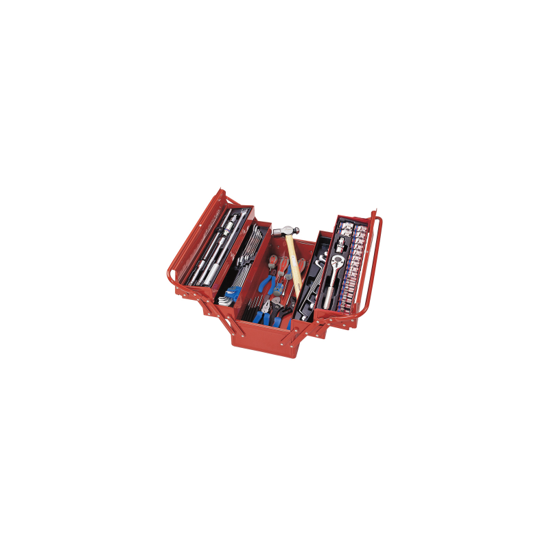 Equipamento Cabeça de 1/2: 10, 11, 12, 13, 14, 15, 16, 17, 18, 19, 20, 21, 22, 23, 24, 27, 30, 32mm Vela de ignição de 1/2: 21 mm 1/2 extensão: 125, 250 mm Extensão de 1/2 (ponta redonda): 50 mm Cardan de 1/2 Catraca 1/2 32 dentes, 250 mm Alça em T de 1/2 300 mm colar articulado 1/2 450 mm Chave de boca: 6x7, 8x10, 11x13, 12x13, 17x19, 22x24 mm Chave G-arr.: HEX. (ponta redonda, longa) 1,5, 2, 2,5, 3, 4, 5, 6, 8, 10 mm Chave de anel: 8x9, 10x11, 12x13, 14x15, 16x17, 18x19 mm Chave de fenda: SLOT. 5,5x100, 6,5x38, 8x175 mmCRUZ. #1x80, #2x38, #3x150 mm Alicate combinado 188 mm Ornitorrincos 163 mm Chave ajustável 0-50mm/250mm Chave ajustável 0-25mm/200Martelo 580g Cinzel: 17x150, 23x200 mm Desvio: 3x40, 4x50, 5x55, 6x55 mm Punção central: 4x120 mm.