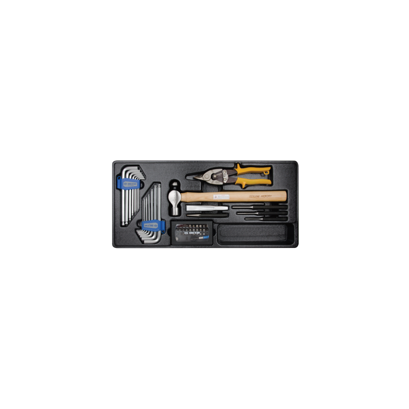 Especificações do conjunto 9-90154CR :Chaves Allen 1130MR: 2,5, 3, 4, 5, 6, 8, 10 mm,Chaves Allen 1130SR: 3/32, 1/8, 5/32, 3/16, 1/4, 5/16, 3/8 de polegada,Punção central 761: 4 x 120 mm,Punções 764: 3 x 125, 4 x 150, 5 x 165 mm,Comprimento do martelo: 353 mm,Dimensões do inserto: 554 x 260 mm,Peso: 2,86kg.