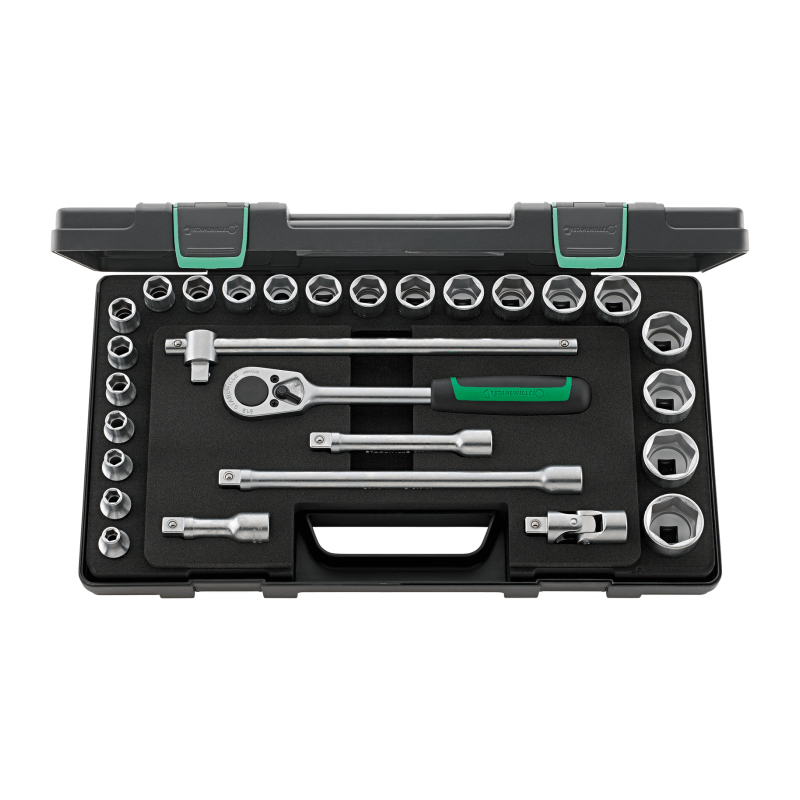 - 22 chaves de caixa com hexágono nº 52: 8; 9; 10; 11; 12; 13; 14; 15; 16; 17; 18; 19; 20; 21; 22; 23; 24; 26; 27; 28; 30; 32 mm;