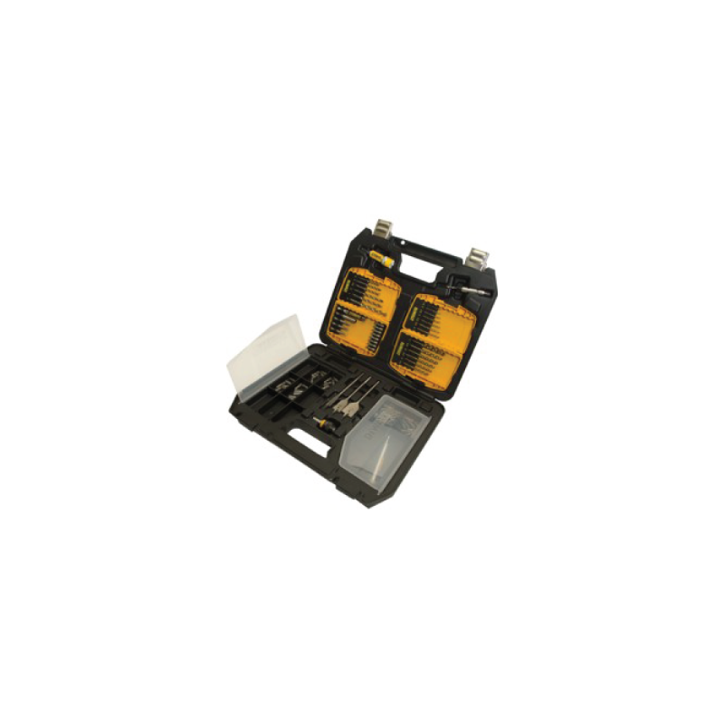 O conjunto de local de trabalho DeWalt DT9296 - 90 peças vem em uma caixa de plástico robusta com travas de metal resistentes. O conjunto contém uma variedade de brocas, brocas planas e pontas de chave de fenda. O conjunto contém: 6 x brocas de alvenaria extrema:4, 5, 5,5, 6, 7, 8mm; 13 bits extremos HSS: 1,5, 2, 2,5, 3, 3,2, 3,5, 4, 4,5, 5, 5,5, 6, 6,5,7 mm; 3 x brocas planas: 12, 18, 25mm;29 bits PZ2 de 25 mm; 29 bits PH2 de 25 mm; uma broca PZ2 de 50 mm; uma broca PH2 de 50 mm; uma broca SL2 de 50 mm; uma ponta duplae adaptador; e 4 x vários mandris de bits de inserção.