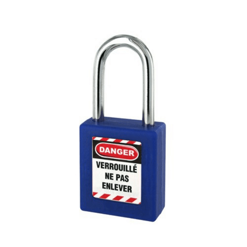 Corpo não condutor de ABS. Arco em aço inoxidável, mecanismo de pino. Ancoragem dupla. Chave parada: O cadeado deve ser fechado para apanhar a chave. 1 chave de latão. Entregue com um conjunto de etiquetas.