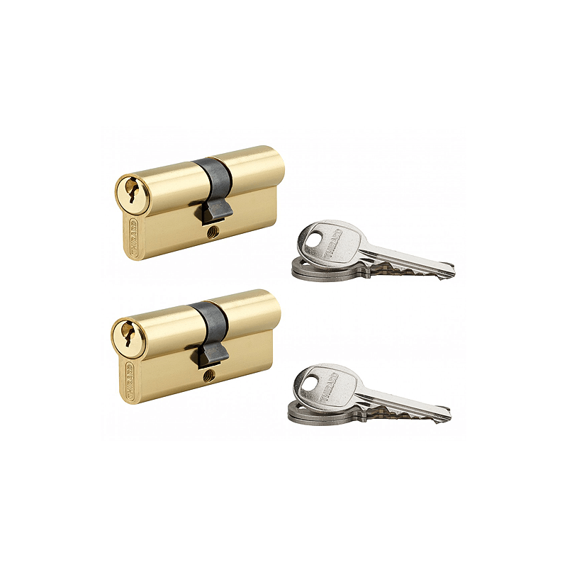 Cilindro de latão de perfil europeu. Mecanismo com 5 esferas. Proteção contra desapego. 3 chaves em aço niquelado.