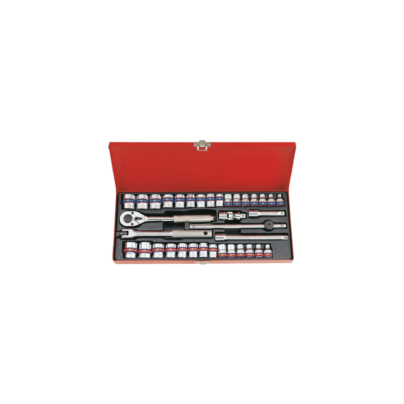Um conjunto de cabeças de soquete dodecaédrico com acessórios 3/8, 6-22mm, 1/4-13/16, 36pcs KING TONY 3036CR armazena e transporta facilmente graças a uma caixa metálica que pode ser fechada com compartimentos individuais para cada componente.