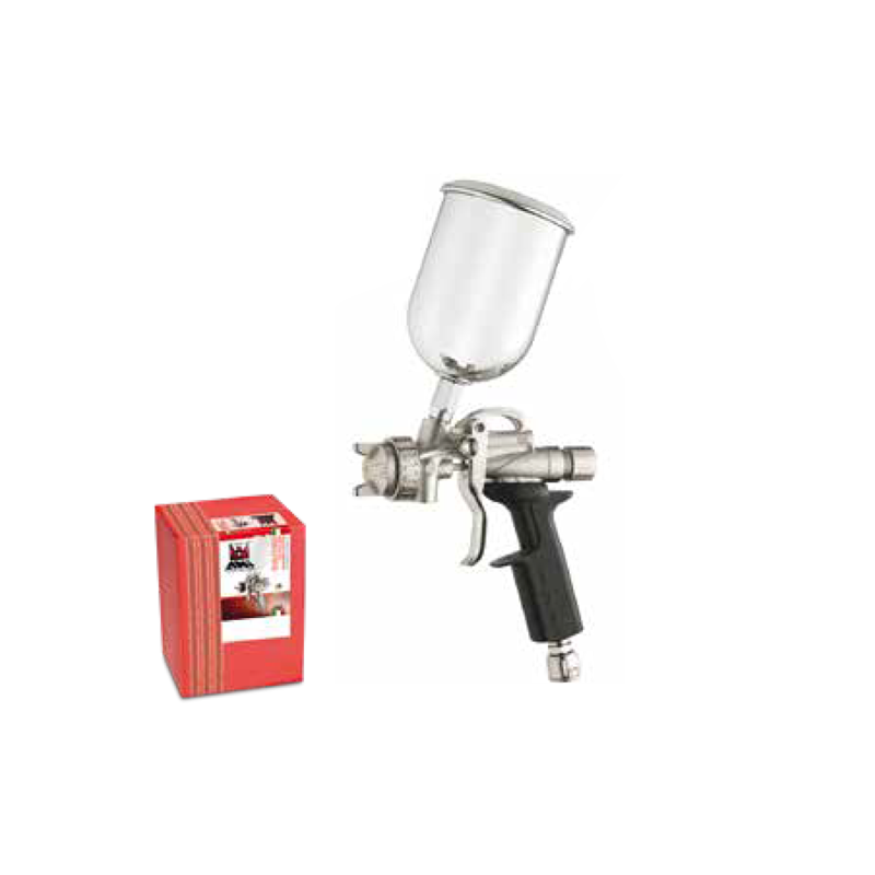 - Pistola de pintura com copo de alimentação por gravidade em alumínio, tampa de nylon e dispositivo de descolamento; - Copo de 500 cc com rosca BSP 3/8M para bicos ø 1.0- ø 1.2- ø 1.5; - Copo de 1000 cc com rosca BSP 3/8M para bicos ø 2.0- ø 3.0- ø 3.5; - Conector 11/A para fornecimento de ar da pistola de pulverização; - Disponível com sistema de pintura convencional; - Embalado em uma caixa com chave de serviço para operações de manutenção.