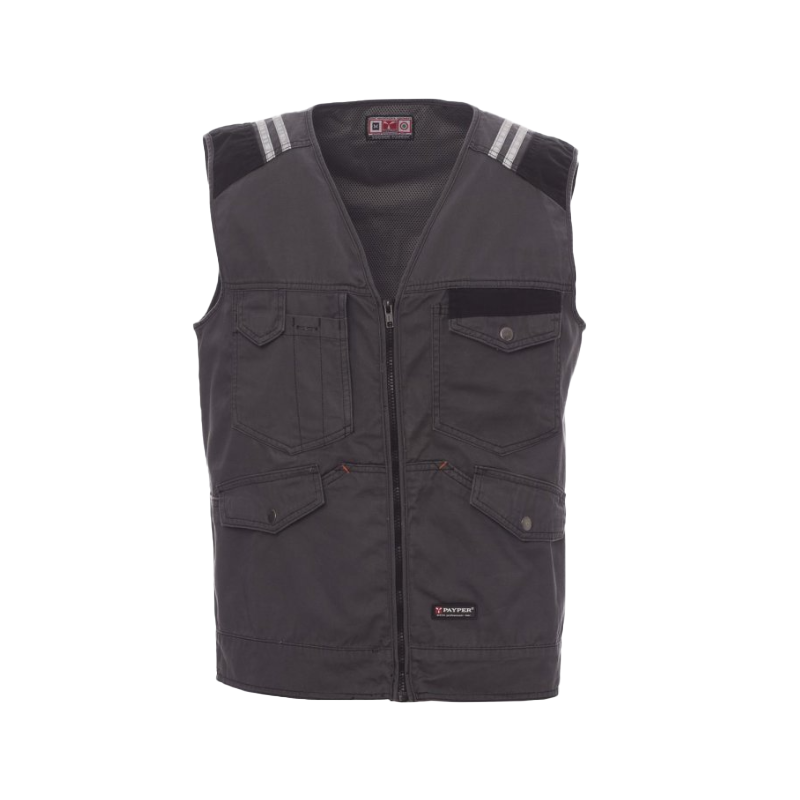 Colete TUCSON CHEMITOOL fecho dianteiro de correr plástico, fecho de botão na cintura, três bolsos dianteiros com LOCK SYSTEM, doisbolsos canguru com aba e botão metálico, suporte de crachá destacável, rebatível, bolso de lapela multifunções. Fitas refletoras nos ombros. Modelo de ajuste aos estilo de calças de ganga. Forro técnico a seco em cor contrastante, abertura para facilitar a estampagem e a aplicação de bordados.